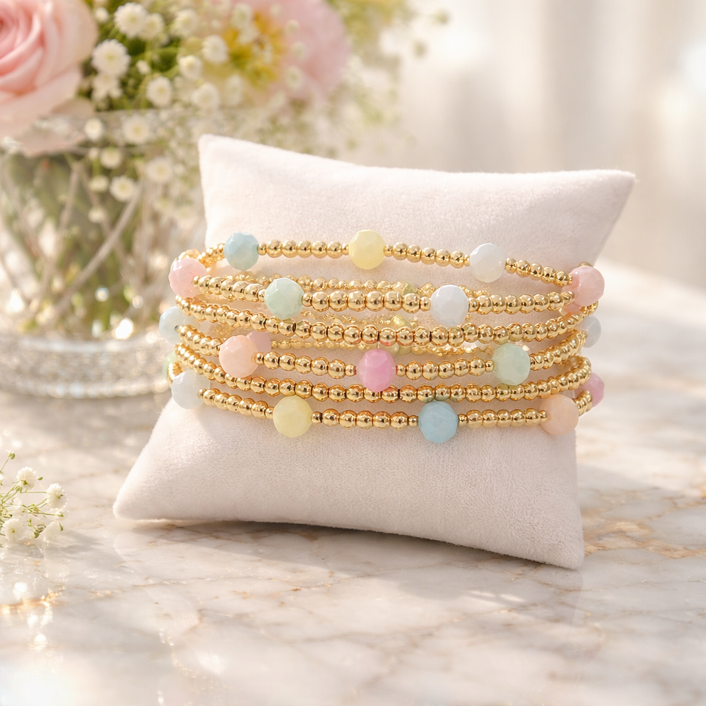 Water Resistant Set of 5 Gold Beaded with Light Multi Crystal Stretch Bracelet