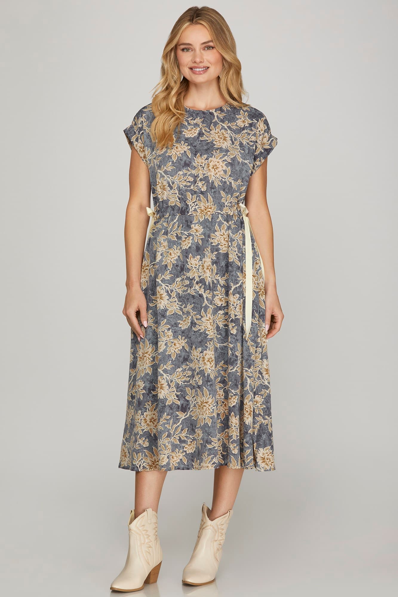DROP SHOULDER WOVEN FLORAL PRINT MIDI DRESS WITH SIDE WAIST TIE AND POCKETS