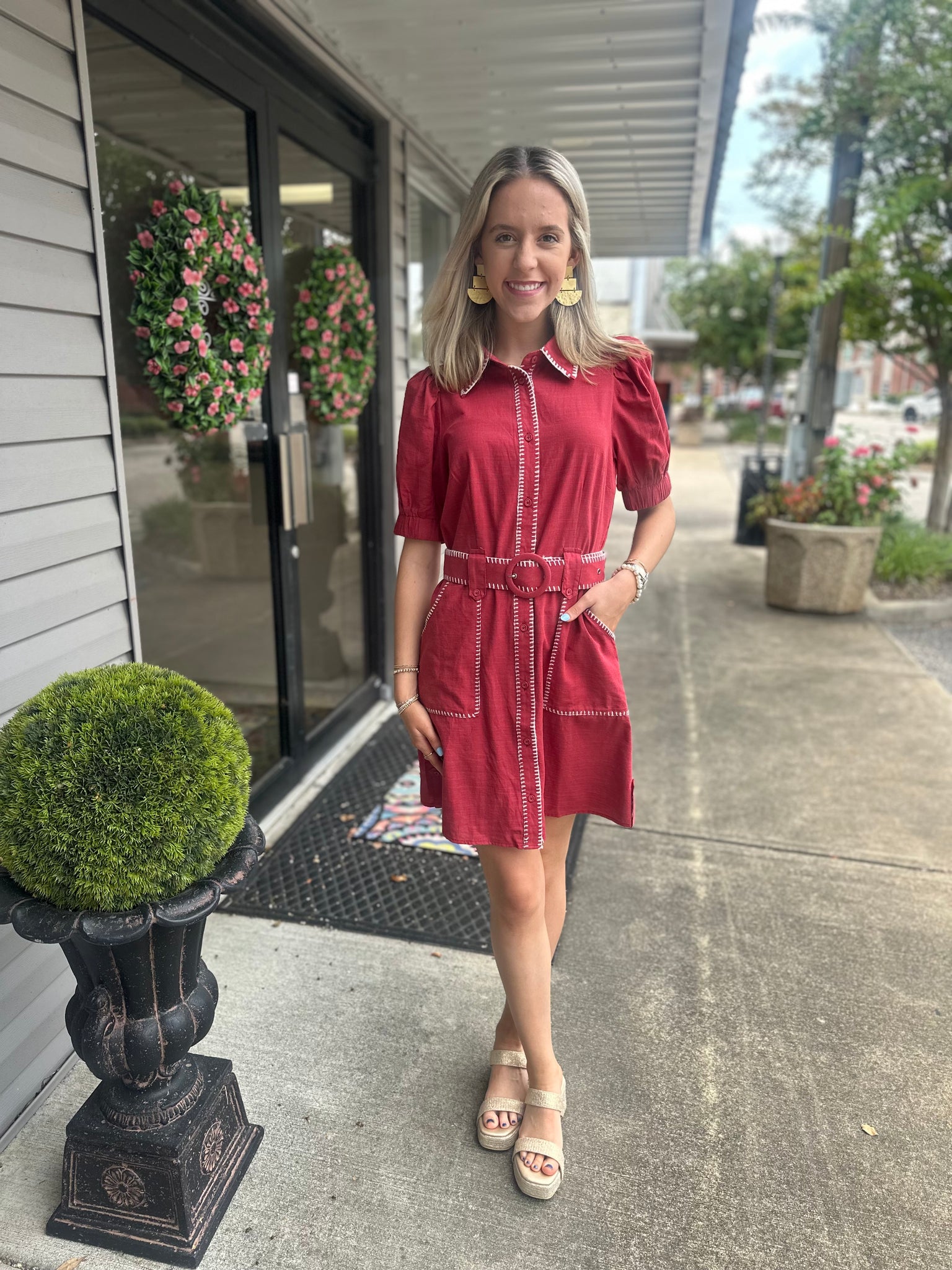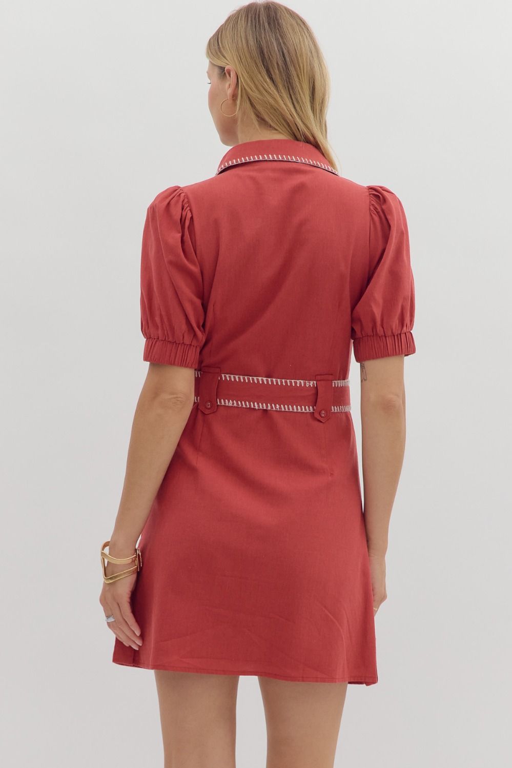 Solid puff sleeve mini dress featuring contrast accent blanket stitch detailing. Removable self-belt. Cargo pockets at front. Lined. Woven. Non-sheer. Lightweight.