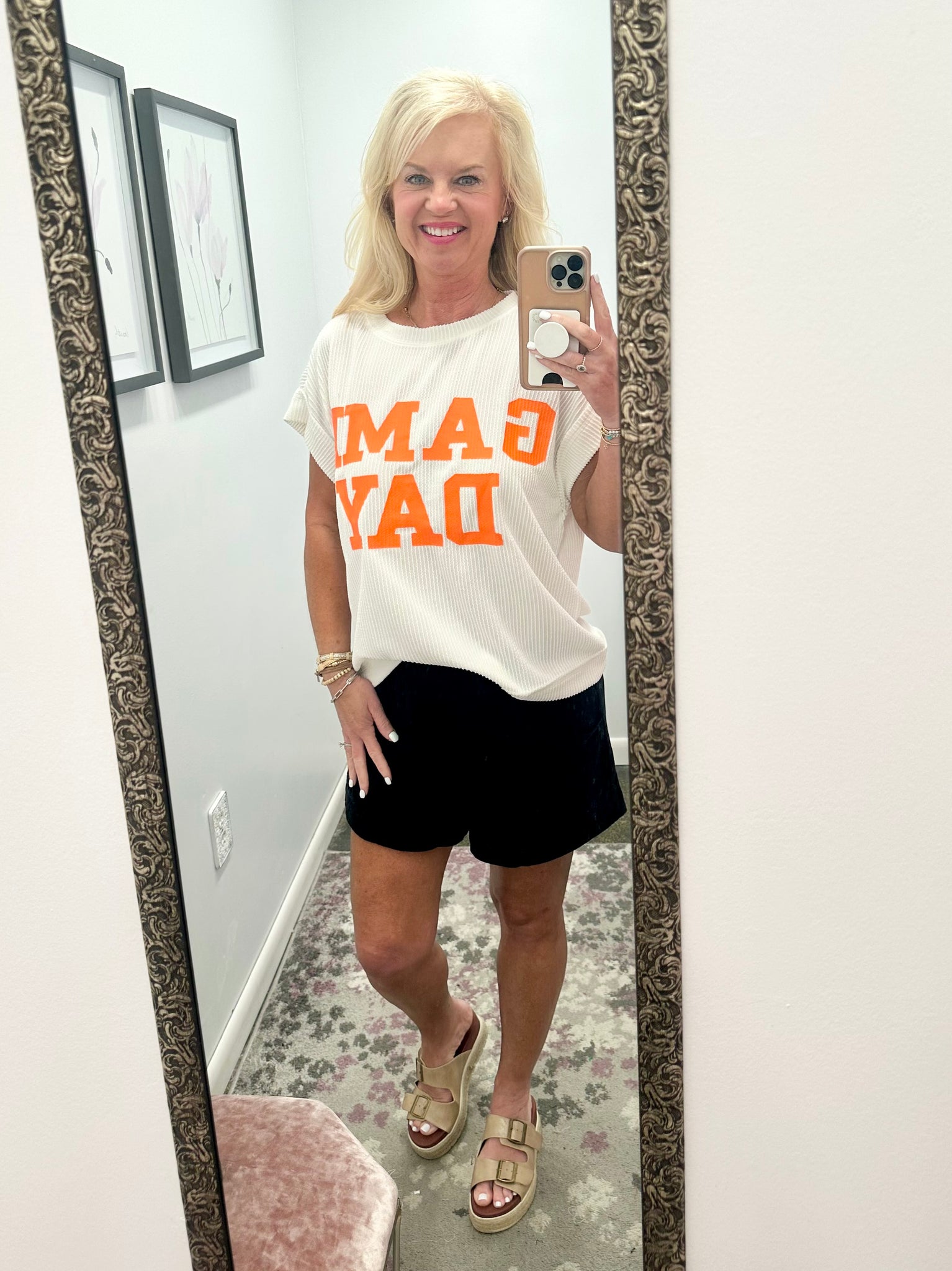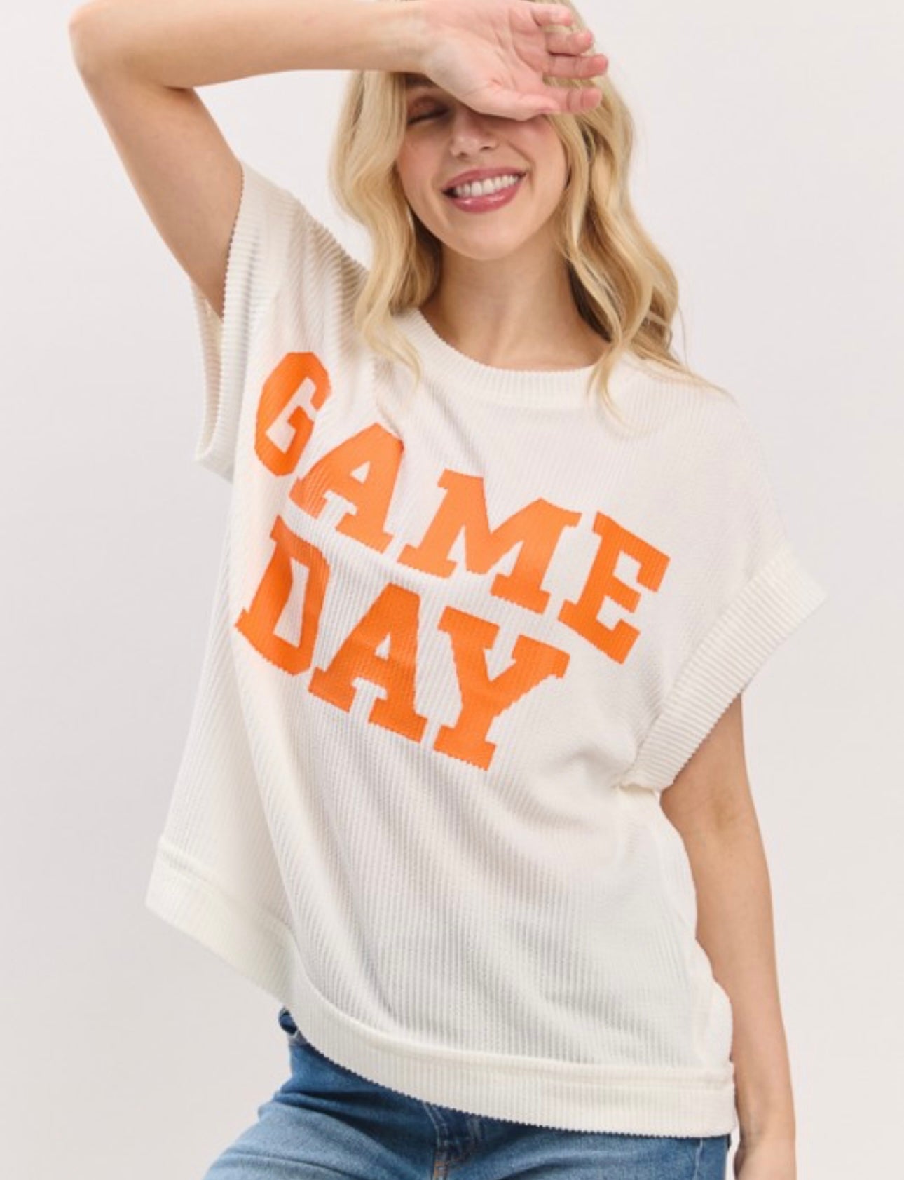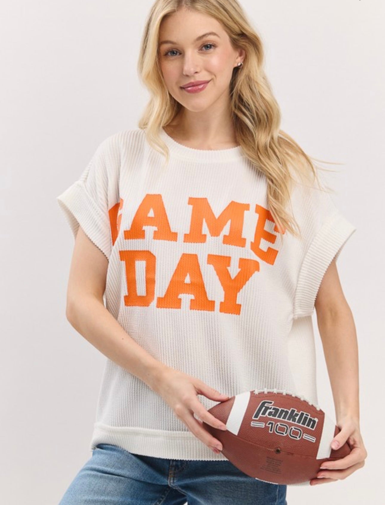 Make a bold statement on game day with this oversized ribbed knit top featuring standout "GAMEDAY" lettering across the front. Designed with a relaxed fit, rolled short sleeves, and a straight hem, this piece combines comfort with sporty edge. The textured rib fabric adds a touch of dimension to your casual weekend look.