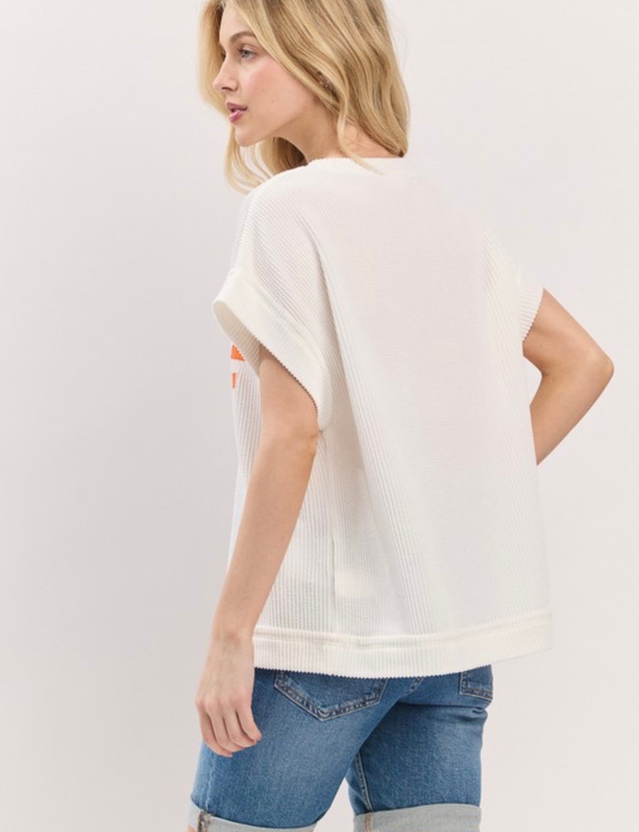 gameday top, ribbed knit tee, oversized gameday shirt, football outfit, textured knit top, casual fall tee, varsity look, letter print shirt, weekend top, sporty oversized tee, tailgate outfit, trendy gameday wear
