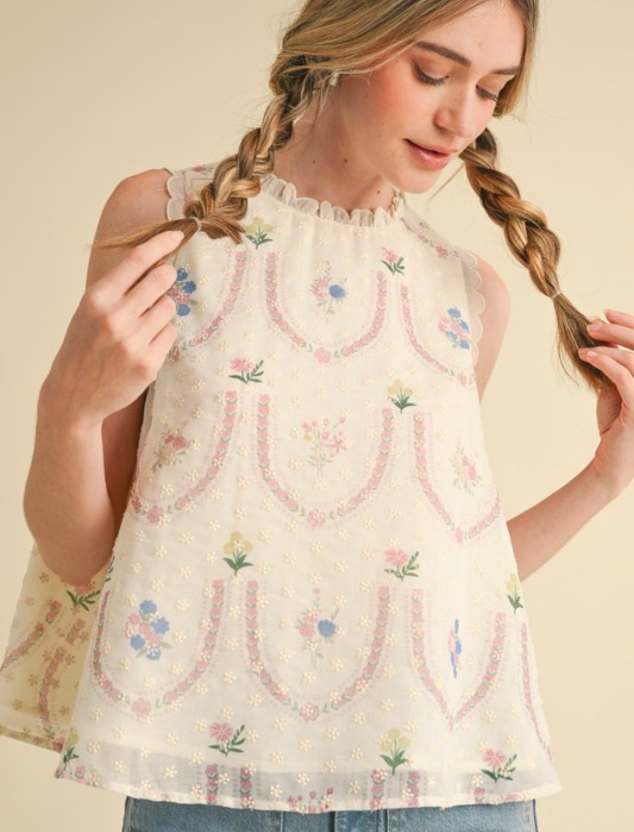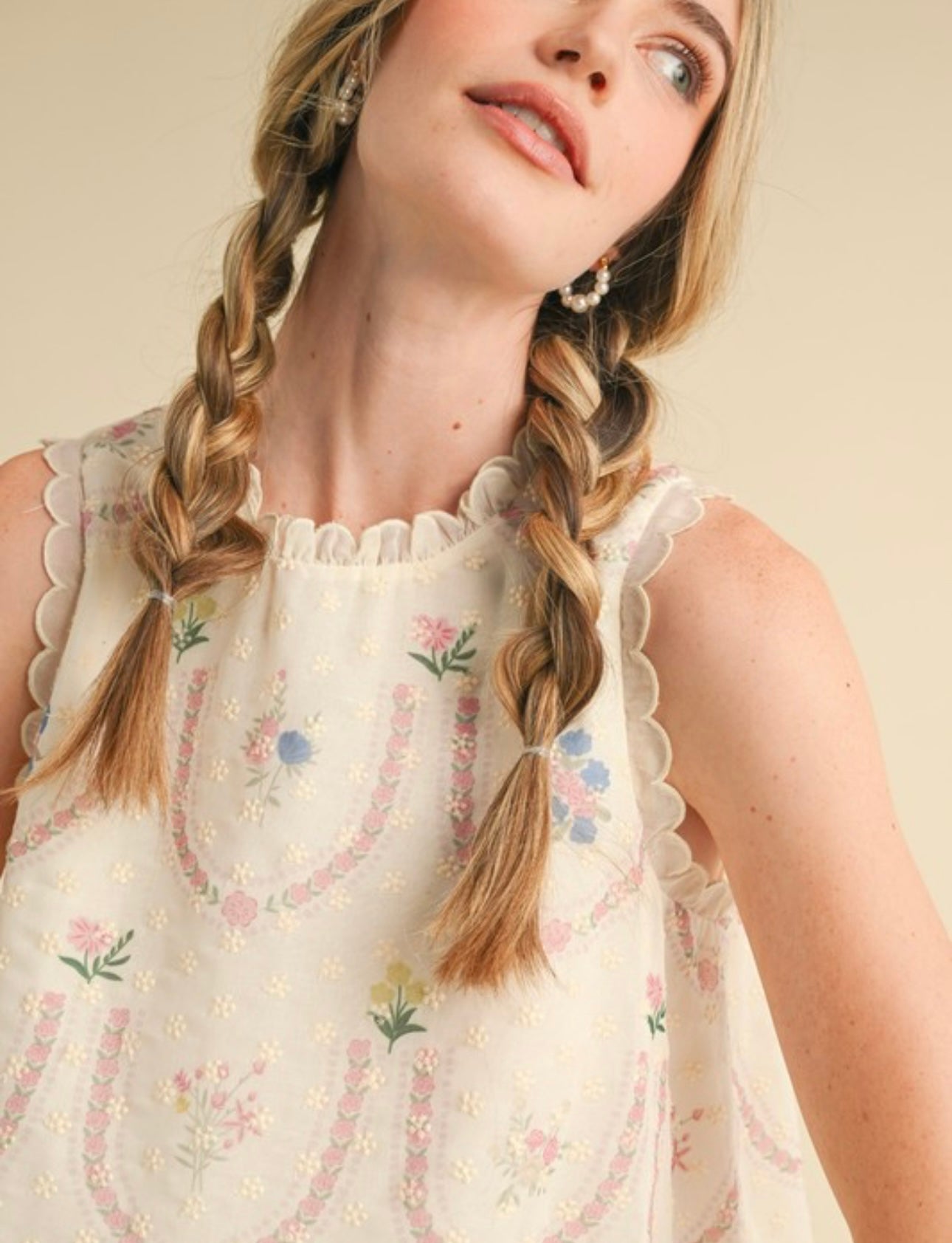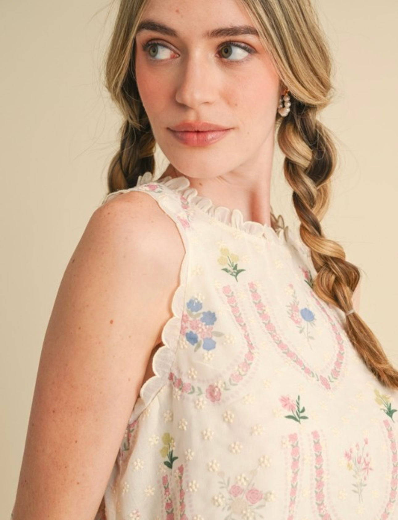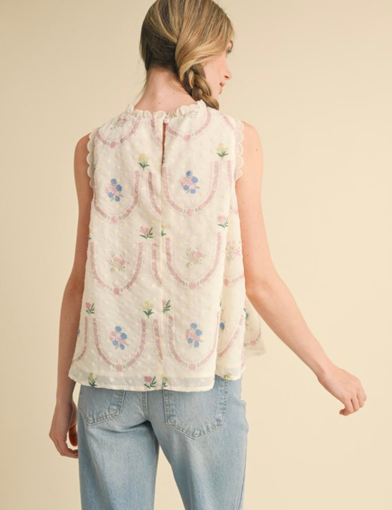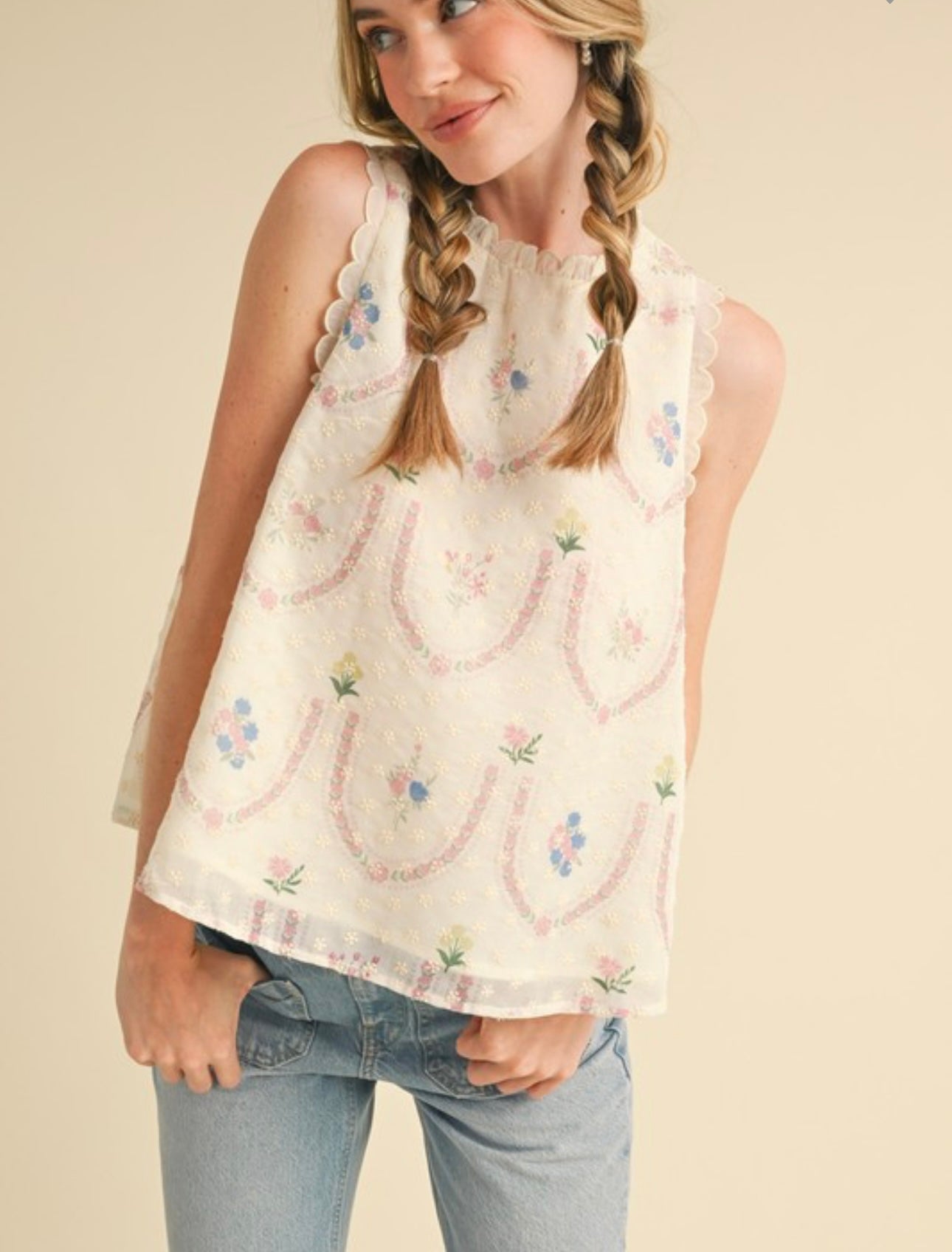+ Floral embroidery babydoll top + Colorful floral print with embroidery + Sleeveless babydoll silhouette with scallop trim + Round neckline with scallop trim + Keyhole on back with button closure + Lined + Model is 5' 10.5" 32-24-36 and wears a S