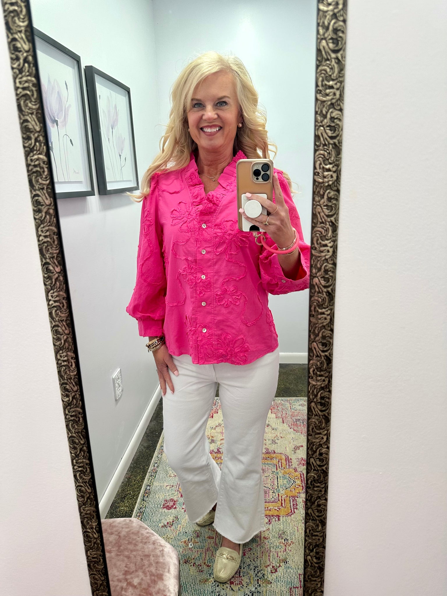 3/4 sleeves button down 3D floral top, textured fabric, ruffled neckline.