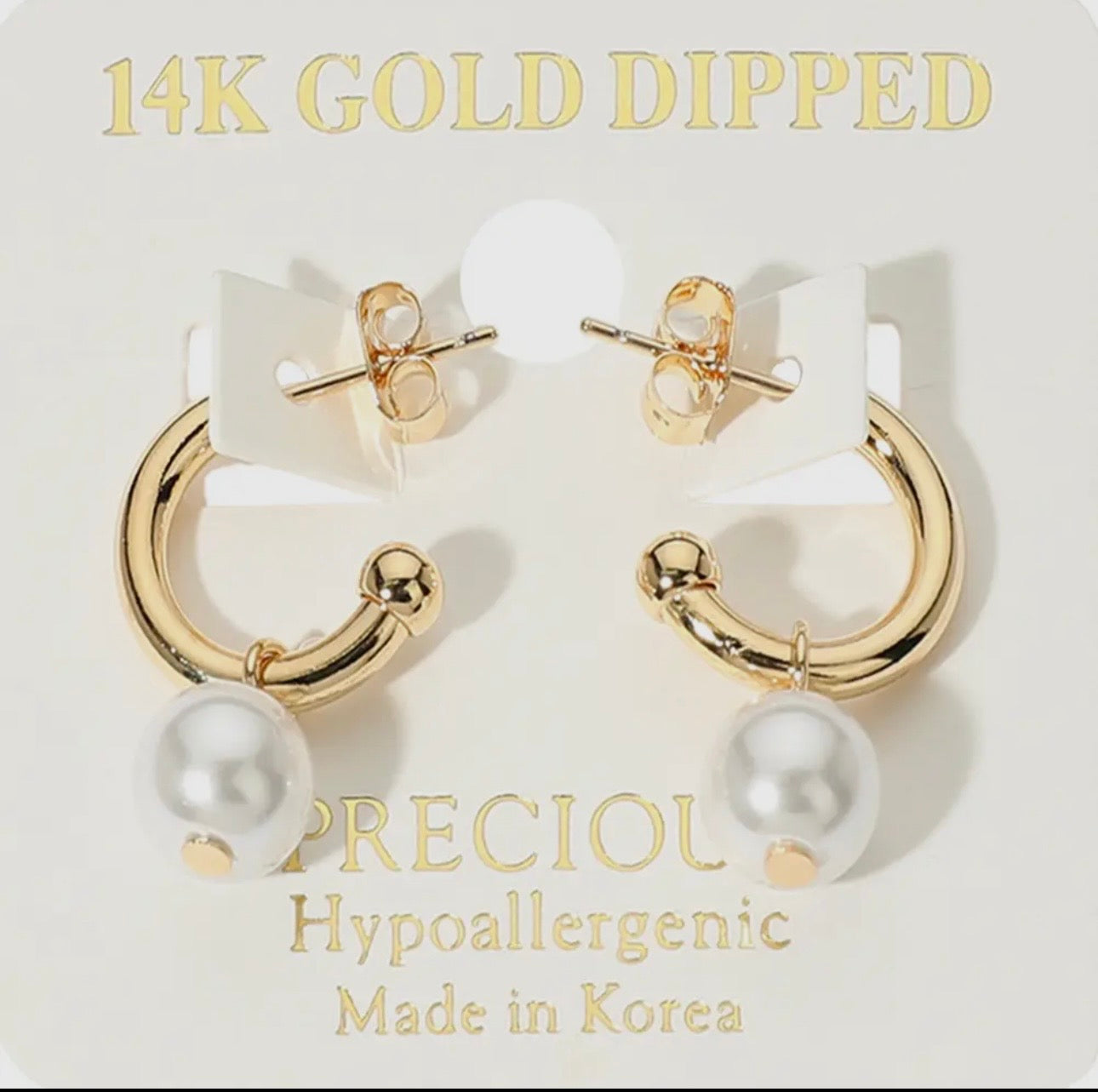 14K Gold Dipped Hypoallergenic Pearl Dangle Hoop Earrings • Size : 0.6" X 1"